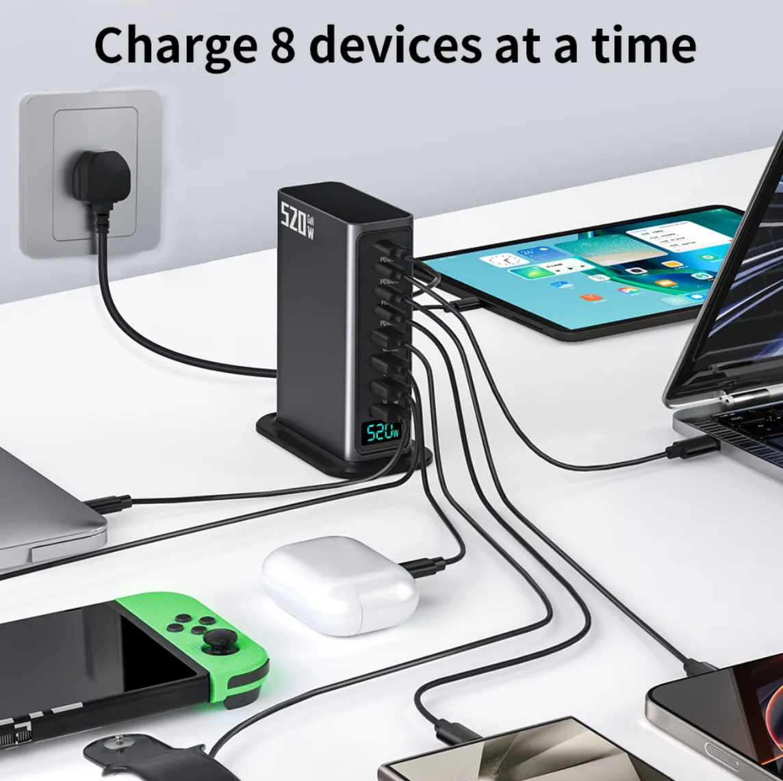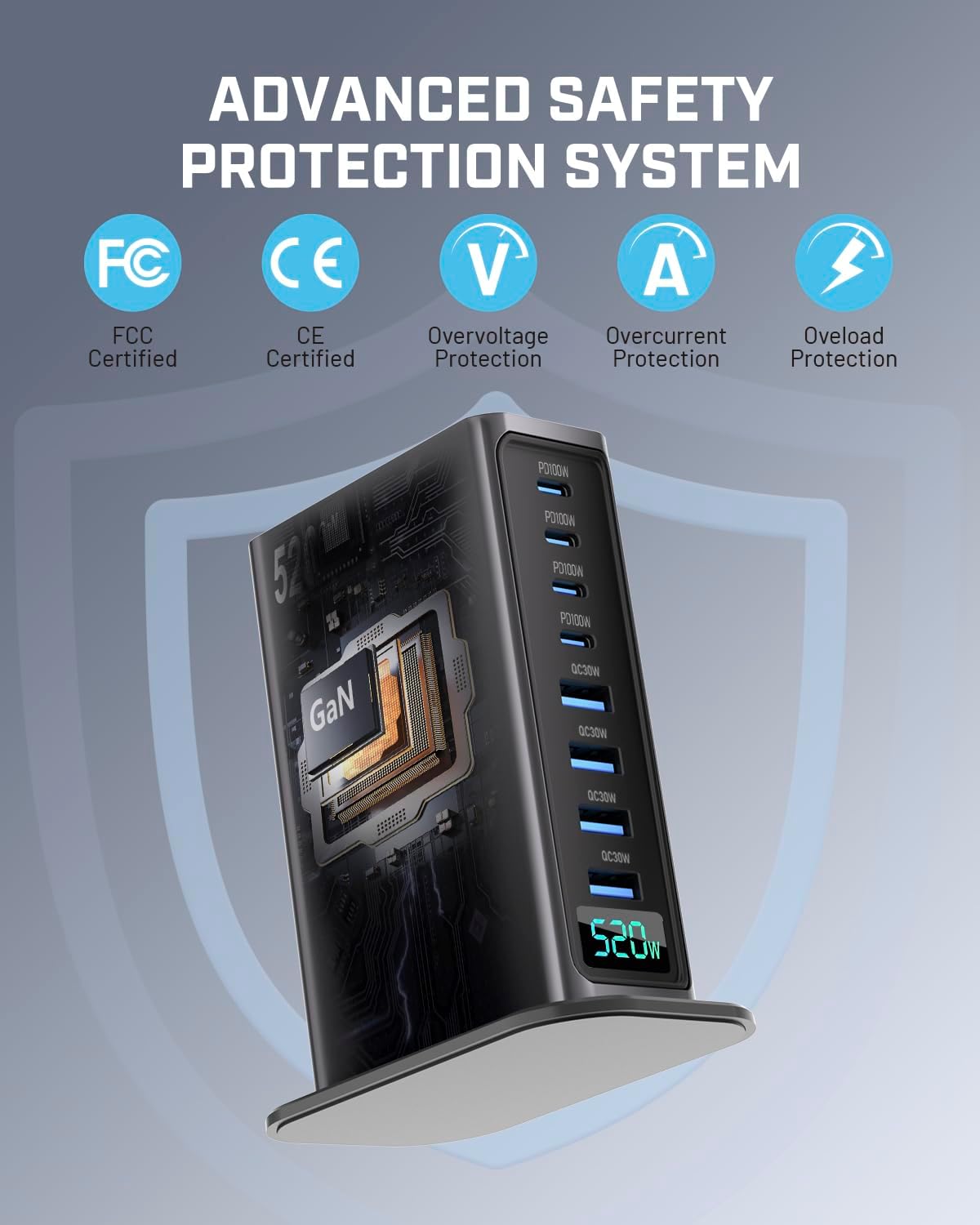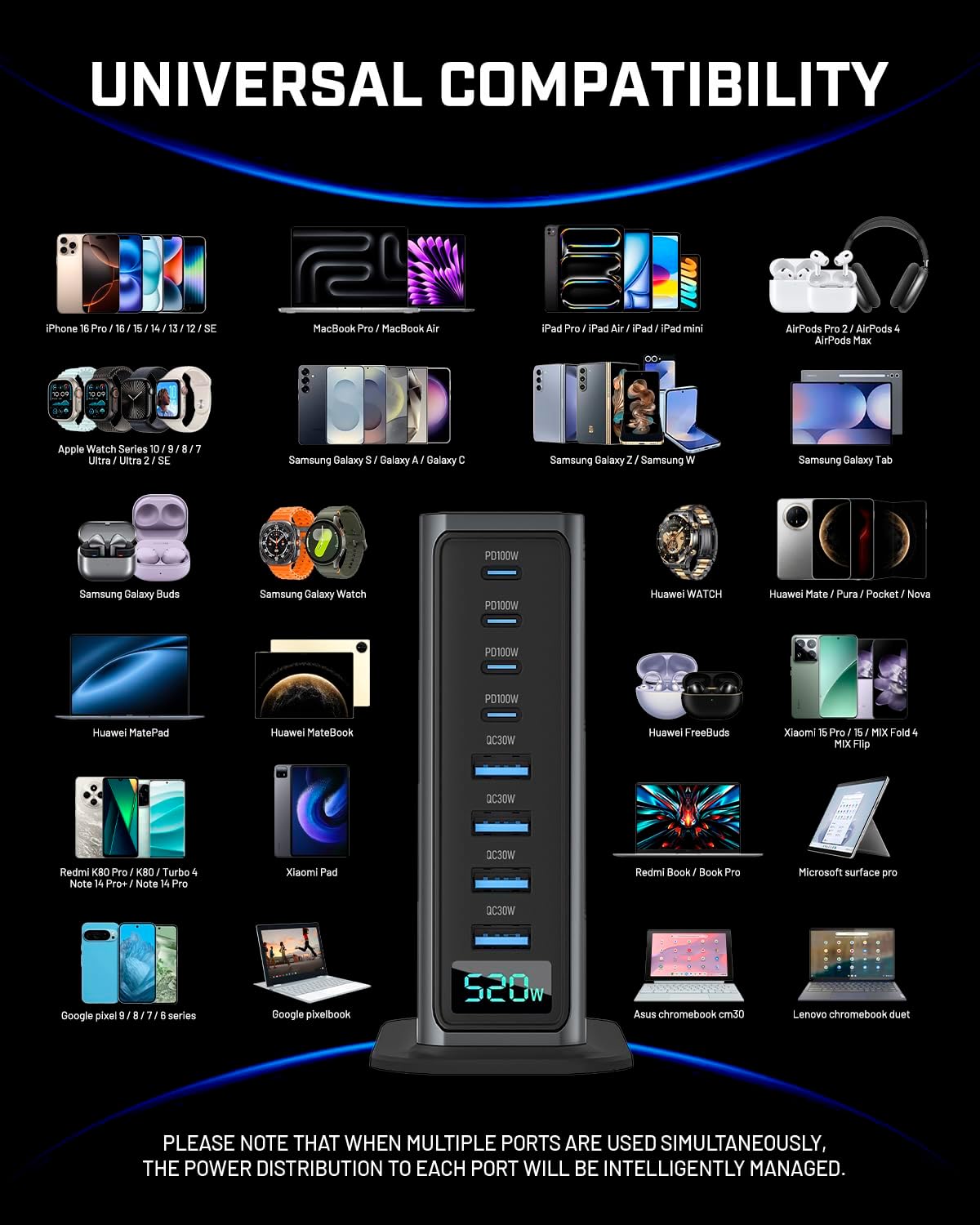 Samsung charger for iphone 520W USB C Charger Block, 8 Ports GaN Fast Charging Station Hub, PD 100w Type C & USB A Laptop Desktop Charger Adapter for MacBook Air/Pro, DELL, iPhone, iPad, Samsung